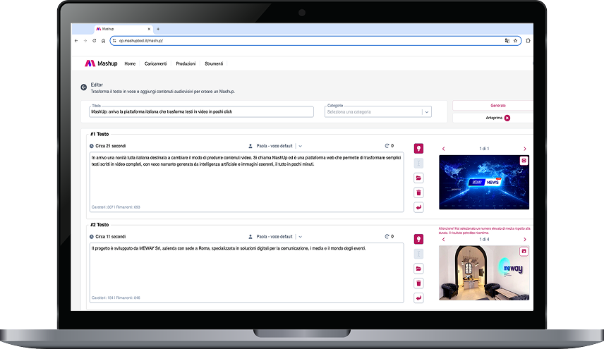 Mashup is the platform that transforms a simple text into audio and video content, thanks to the power of Artificial Intelligence, voice cloning, and a workflow designed to simplify multimedia creation.