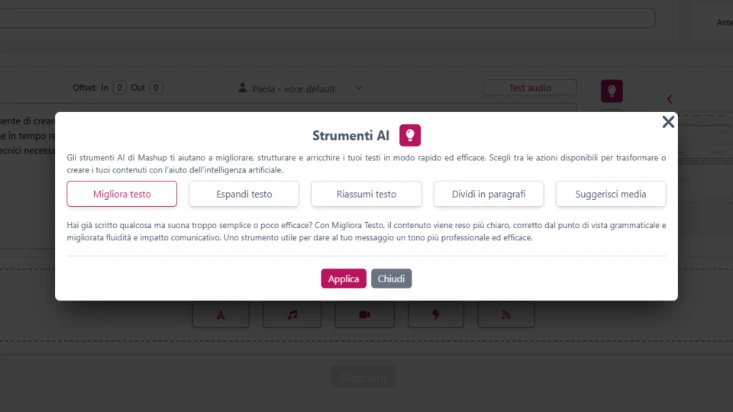 MashUp supporta la scrittura con strumenti di AI che aiutano a generare e rielaborare i testi, mantenendo coerenza stilistica e pieno controllo editoriale.