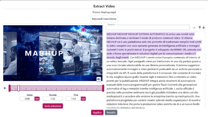 MashUp consente di navigare la trascrizione dei contenuti e di individuare rapidamente i passaggi rilevanti, estraendo clip con precisione e semplicità.