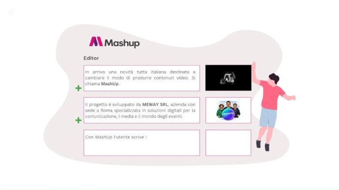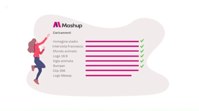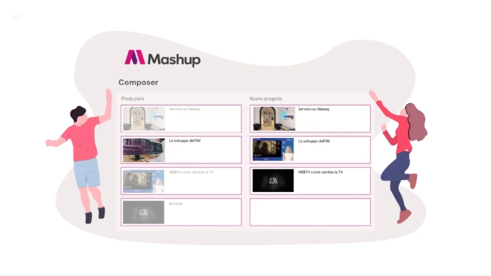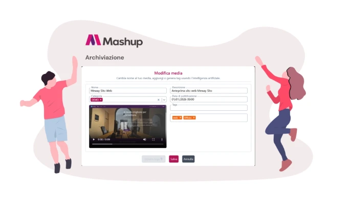 Mashup organizza e gestisce tutti i contenuti multimediali suddividendoli per tipologia, categoria e tag, aiutandoti a cercare e ritrovare rapidamente i media. Video, immagini e audio vengono automaticamente catalogati per facilitare la ricerca, l’utilizzo e il riuso dei contenuti nei diversi progetti.